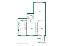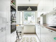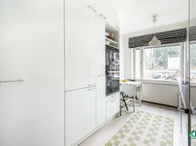 - Jääkaappi/pakastin, kiertoilmauuni, integroitu mikroaaltouuni, astianpesukone, astianpesukoneliitäntä, induktioliesitaso ja liesituuletin filtterillä.