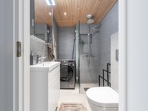 - Pesutilojen kuvaus: Suihku, suihkuseinä, paikka pesukoneelle / -tornille, peilikaappi (Villeroy & Boch), allas, allaskaappi, seinään integroitu wc (Villeroy & Boch), kaakeliseinät, laattalattia ja lattialämmitys.