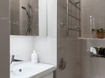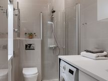 - Pesutilojen kuvaus: kuivauspatteri. Varustus: suihkuseinä, pesukoneliitäntä, wc-istuin, suihku, peilikaappi, kiinteät valaisimet, kylpyhuonekaapisto.