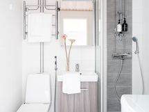 - Pesutilojen varusteet: WC-istuin, suihku, suihkuseinä, pesukoneliitäntä, lattialämmitys, peilikaappi ja allaskaappi. Pesutilojen kuvaus: Laatoitettu kylpyhuone remontoitu putkiremontin yhteydessä 2018.