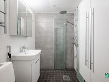 - Kylpyhuone, suihku, erillinen wc, suihku/suihkukaappi, peilikaappi, pesukoneliitäntä, kylpyhuonekaapisto, kiinteät valaisimet