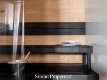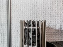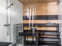 - Kuvaus: Osittain kaakeloitu, osittain puupaneeliseinät. Sähkökiuas (Helo). Käsiltelty Supi-saunasuojalla. Lattia; kivi.