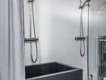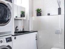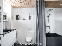 - Pesutilojen kuvaus: Ylellinen spa-saunaosasto, jossa Durat tasot sekä Durat kylpyamme. Il Bagno Alessi Dot by Oras- hana. Seinä-WC. Bidee-suihku, Kaksi erilistä suihkua, joissa sadesuihkut sekä käsisuihkupäät. Lasinen suihkuseinä ja lasinen saunan seinä. Hyvin kaappitilaa, valaistu peilikaappi, pesukoneliitäntä/tila pesutornille. Lattialämmitys. Erillisen WC:n kuvaus: Yläkerrassa tilava erillinen wc: Durat-taso, seinä-WC, valaistu peilikaappi. Il Bagno Alessi Dot by Oras- hana, pesuallas. Bidee-suihku. Kokonaan kaakeloitu, kivilattia. Lattialämmitys.