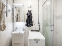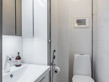 - Pesutilojen varusteet: Suihku, suihkuseinä, pesukoneliitäntä, lattialämmitys, peili, pesuallas, allaskaappi ja rättipatteri. Erillisten WC:n lukumäärä: 1. Erillisen WC:n varusteet: WC-istuin, lattialämmitys, peili, pesuallas, allaskaappi ja bidee-suihku.