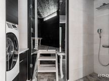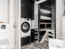 Kuivaava pesukone integroitu. Lattialämmityksen kytkin makuuhuoneen puolella.
