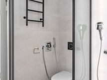 - Pesutilojen varusteet: WC-istuin, suihku, lattialämmitys, pesukoneliitäntä, pesukone ja bidee-suihku. Pesutilojen kuvaus: Kaksi kylpyhuonetta, joissa molemmissa Temalin kylpyhuonekalusteet. Suihkut Hansgrohe Raindance. Lavuaareissa Oraksen kosketusvapaat hanat. Molempien vessojen yhteydessä käsisuihku.