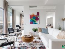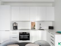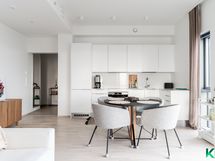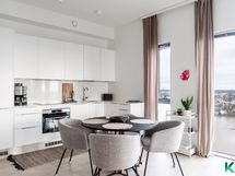 - Novartin toimittama keittiö. Kalusteintegroitu jääkaappi-pakastin ja astianpesukone, induktioliesi, erillisuuni, liesituuletin, kvartsikomposiittityötasot,