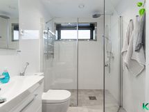 - Sadesuihku, suihkuseinä, wc -istuin, bidee suihku, hana ja allas, valaistu peili, kylpyhuonekaapistot, pyyhekuivain, pyykinpesukoneliitännät, lattialämmitys (sähkötoiminen), ikkuna