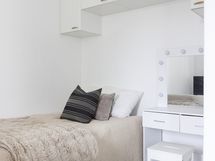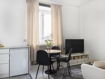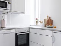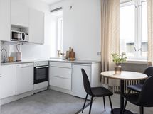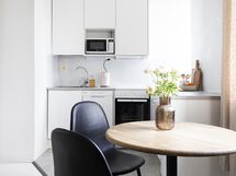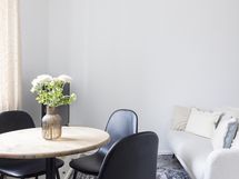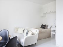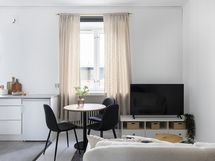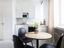 Asunnon ilme on kauniin harmoninen: juuri uusittu keittiö kodinkoneineen, vastamaalatut pinnat sekä vaalea lautalattia luovat raikkaan ja ajattoman kokonaisuuden. Kylpyhuone puolestaan säihkyy uutuuttaan vastavalmistuneen linjasaneerauksen jälkeen.