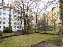Hissillisen talon ylimmästä kerroksesta avautuvat avarat näkymät rauhalliseen ja vehreään Taka-Töölöön. Uusitut keittiön kaapistot ja runsas tasotila tekevät kokkailusta miellyttävää – lisämukavuuksina mm. astianpesukone.