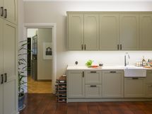 Keittiö on suunniteltu sekä käytännölliseksi että persoonalliseksi. Puusepän valmistamat täyspuiset kaapistot jugend-henkisin yksityiskohdin luovat tilaan lämpimän ja ajattoman ilmeen. Keittiöön mahtuu hyvin suuri ruokapöytä, mikä tekee siitä luontevan paikan arjen kohtaamisille.