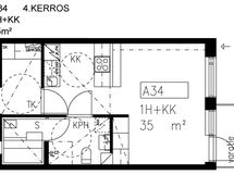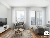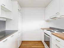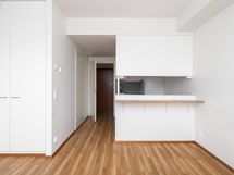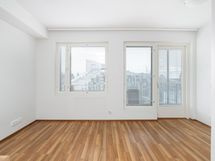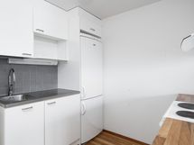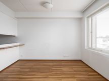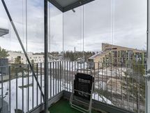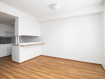 Tässä avarapohjaisessa asunnossa neliöt on käytetty tehokkaasti. Keittokomero avautuu osittain huoneen puolelle, mikä tuo tilaan enemmän avaruutta ja päästää luonnonvaloa myös keittiön puolelle. Huoneesta on käynti omalle lasitetulle parvekkeelle, joka toimii viihtyisänä lisätilana lämpiminä kuukausina.