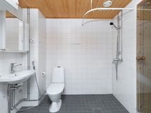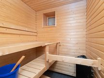 Laatoitetussa kylpyhuoneessa on tilavaraus pyykinpesukoneelle, ja oma sauna tuo arkeen mukavaa lisäarvoa myös kompaktissa kodissa.