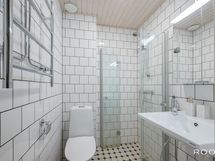 Pesutilojen varusteet: WC-istuin, suihkuseinä ja peilikaappi.