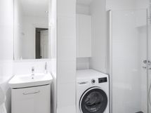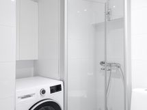 - Ajattomaan tyyliin remontoidussa kylpyhuoneessa on lattialämmitys sekä suihkutilassa taittuvat suihkuseinät. Hanat Hansgrohe. Tilaan mahtuu täysleveä pesukone tai pesutorni.