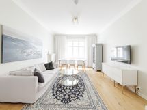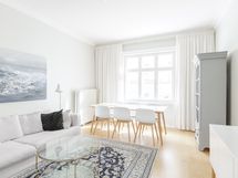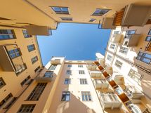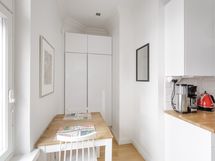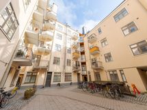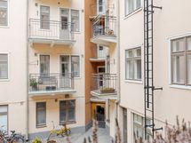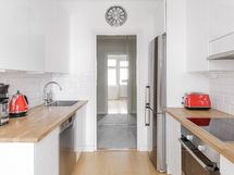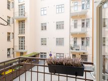 Tammiparketti, seinät maalattu. Viehättävä sisäpihan parveke aukeaa suoraan keittiöstä.