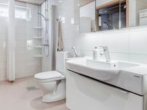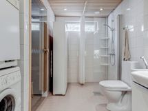 - Pesutilojen varusteet: WC-istuin, suihku, suihkuseinä, pesukoneliitäntä, lattialämmitys, peilikaappi ja allaskaappi. Pesutilojen kuvaus: Tilava sauna-kylpyhuoneyhdistelmä. Erillisten WC:n lukumäärä: 1. Erillisen WC:n varusteet: WC-istuin, peilikaappi, pesuallas, allaskaappi ja bidee-suihku.
