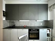 - Tilaa isolle ruokapöydälle, paljon kaappitilaa, paljon työskentelytilaa, suuri tiskipöytä, laminaattitaso, integroidut koneet, astianpesukone, induktioliesi, liesituuletin, jääkaappi ja pakastin.