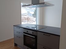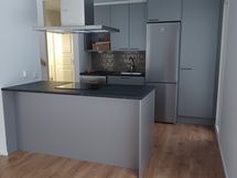 - Saarekkeellinen avokeittiö. Keittiön varusteet: jää-pakastinkaappi, astianpesukone, induktioliesi, monitoimiuuni, liesituuletin. Työtaso laminaattia. Puustellin kalusteet ja Electroluxin kodinkoneet. Laminaattilattia, laatoitettu välitila.