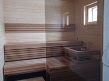 - Löylyhuoneen seinissä ja katossa kuusipaneeli; lauteet lämpökäsiteltyä haapaa; lauteisiin sovitettu sähkökiuas Harvia Cilindro PC90XE; pronssisävyinen lasiseinä kylpyhuoneeseen.