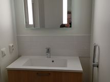 - Yläkerran kylpyhuoneessa WC, suihku, pesuallas, allaskaappi, valopeili, lattialämmitys. Seinät ja lattia laatoitettu, pronssiin sävytetty lasiseinä löylyhuoneeseen. Kuusipaneelikatto.