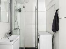 - Pesutilojen varusteet: WC-istuin, suihku, suihkuseinä, peili, pesukoneliitäntä ja allaskaappi (kaksi säilytyskaappia). Pesutilojen kuvaus: Kylpyhuoneen lattialaatat maalattu 10/2021 ja silikonit vaihdettu, laattalattiat maalattu uudelleen 09/2025.
