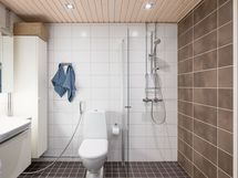 - Pesutilojen kuvaus: Tilava kylpyhuone, jossa peilikaappi, tasollas, allaslaatikosto, wc-istuin, bidee-suihku, suihkuseinä ja suihku.