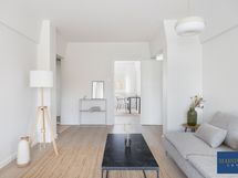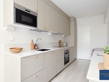 - Keittiön varusteet: Jääkaappipakastin, astianpesukone, mikroaaltouuni, erillisuuni, liesi (induktio) ja liesituuletin (suodatin). Työtason materiaali: Kvartsikomposiitti.