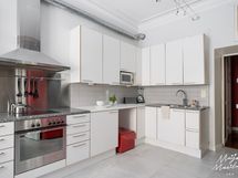 Huoneiston keittiöön on sijoitettu uuni, liesi, liesituuletin ja Smeg- jääkaappi-pakastin. Kylpyhuone/wc:ssä on kylpyamme ja tilaa pesukoneelle. Asunnon upeat yksityiskohdat kuten kattopyöristykset, kattorosetit, eteishallin kaarikatto, vanhat peiliovet, paksut kiviseinät ja hulppea huonekorkeus noin 3,3 metriä tuovat upeaa tunnelmaa.