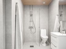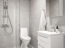 Pesutilojen varusteet: WC-istuin, suihkuseinä, pesukoneliitäntä, lattialämmitys, peilikaappi, pesuallas, allaskaappi ja bidee-suihku.