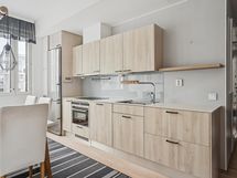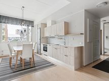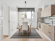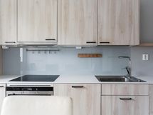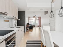 - Jääkaappi/pakastin, astianpesukone, induktioliesi, monitoimiuuni, liesituuletin, kaapistot (Puustellin runko, Elegia ovet). Avohylly.