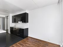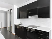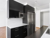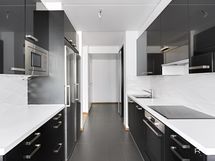 - Keittiön varusteet: Erillinen pakastin, liesi, liesituuletin, mikroaaltouuni, astianpesukone ja jääkaappi. Liesi: Induktioliesi. Työtason materiaali: Laminaatti. Korkeakiiltoinen, tyylikäs musta-valkoinen keittiö, välitilassa valkoinen laatta, lattiassa harmaata isokokoista laattaa, joka jatkuu eteiseen.