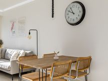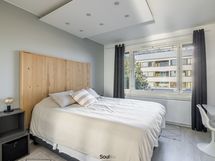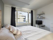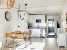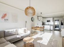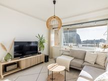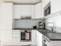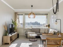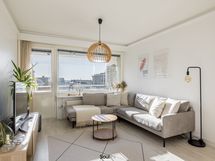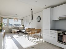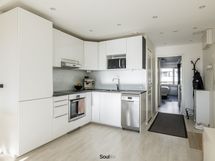 Keittiö on uusittu vaalean sävyiseksi ja varusteltu laadukkain kodinkonein. Tilavammallekin ruokailuryhmälle on selkeä paikka. Olohuone on tilava, ja se yhdistyy luontevasti keittiöön ja parvekkeelle. Olohuoneen katon rajassa kulkee säädettävä tunnelmavalaistus. Vaalea laminaattilattia jatkuu koko huoneiston läpi, luoden rauhallisen ja yhtenäisen ilmeen.