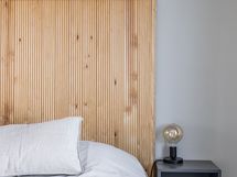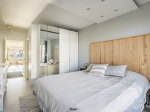 Makuuhuone on reilun kokoinen. Tilaan sopii hyvin myös työpiste, ja huoneen yhteydessä sijaitsee käytännöllinen vaatehuone.