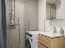 Kylpyhuone on uusittu vuonna 2019 perinteisen linjasaneerauksen yhteydessä. Tilassa on suihkuseinä, lattialämmitys ja paikka pesukoneelle.