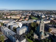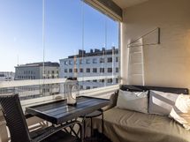 Lasitettu parveke avautuu kohti Kallion kirkkoa, tarjoten upeat näkymät jopa merelle asti. Parvekkeella saa nauttia valosta ja näkymistä alkukeväästä pitkälle syksyyn.
