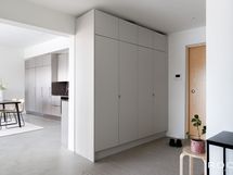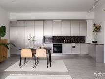 Huoneisto on Meanderin harvinaisuuksia – ainoa asunto, jossa sisustus mukailee Steven Hollin alkuperäistä visiota. Materiaalit ovat harkittuja ja ajattomia: kallion ilmettä muistuttava lattia, harjatusta teräksestä toteutettu keittiö sekä lämpimät sävyt kaapistoissa ja kylpyhuoneessa. Keittiötä on päivitetty laadukkaammaksi, ja kokonaisuutta täydentävät lisätaso kaappeineen sekä valaistu aamiaiskaappi.