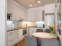 - Vaaleansävyinen keittiö, varusteina astianpesukone, jääkaappi/pakastin, integroitu uuni ja tasoliesi.