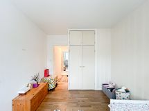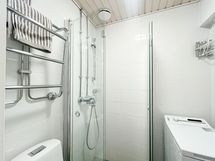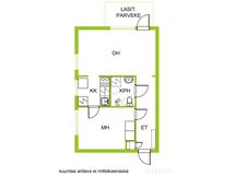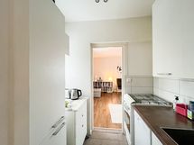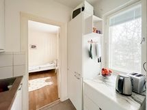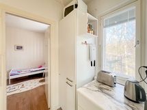 Makuuhuoneeseen mahtuu helposti suuri sänky, ja keittiö sijoittuu käytännöllisesti makuuhuoneen ja olohuoneen väliin. Toimiva ja selkeä pohjaratkaisu yhdistää tilat luontevasti, sillä olohuoneesta on käynti sekä keittiöön että makuuhuoneeseen. Kylpyhuone on siisti ja se on varustettu pesukoneliitännällä.