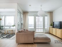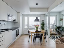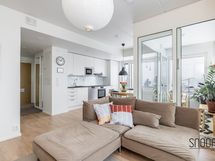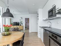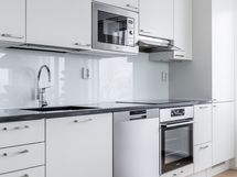 - Keittiön varusteet: Jääkaappipakastin, erillisuuni, liesi, liesituuletin, mikroaaltouuni ja astianpesukone. Liesi: Induktioliesi. Työtason materiaali: Kvartsikomposiitti.