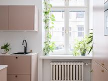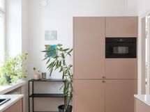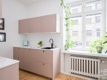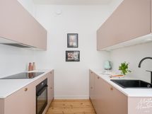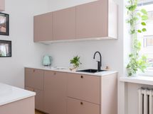 - Lautalattia, maalatut seinät. Kvartsitasot. Roosapuuterinsävyiset kaapistojen ovet (A.S.Helsingö), Ikean rungot. Liesi, uuni, mikroaaltouuni, jääkaappi-pakastin, astianpesukone ja liesituuletin.