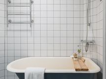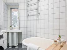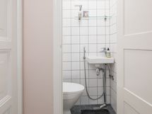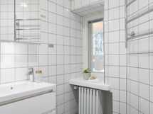 - Pesutilojen kuvaus: Lattia laattaa ja seinät laattaa. Pesukoneliitäntä, suihku, kylpyamme. Allaskaappi, allas, allashana ja peilikaappi. Lattialämmitys ja pyyhepatteri. Ikkuna. Erillisen WC:n kuvaus: Lattia laattaa ja seinät laattaa. Allas, allashana, bideesuihku, wc-istuin.