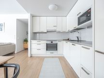 - Avokeittiön lattia on parkettia ja seinät on maalattu. Liesi, liesituuletin, astianpesukone, jääkaappi/pakastin, mikroaaltouuni.