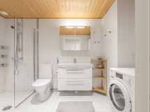 Suihku, suihkuseinä, allas, allaskaappi, peilikaappi, pesukoneliitäntä.