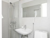 - Pesutilojen kuvaus: Kylpyhuoneessa on wc-istuin, suihku, allas, peili ja suihkuseinä.