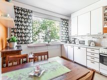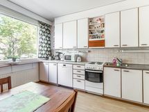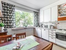 - Keittiön varusteet: Jääkaappipakastin, liesituuletin, liesi ja astianpesukone. Liesi: Sähköhella. Työtason materiaali: Laminaatti.