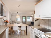 - Keittiön varusteet: Jääkaappi, liesi, liesituuletin, uuni ja astianpesukone. Liesi: Induktioliesi.
