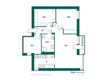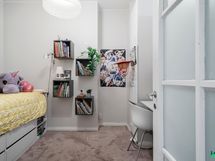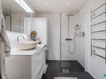 - Kylpyhuone, karamiikkatasot, pesuallas (Woodio), kääntyvät lasiovet, peilikaappi, pesukoneliitäntä, lattialämmitys, kylpyhuonekaapisto, kiinteät valaisimet, suihku/suihkukaappi