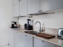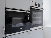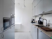 - jääkaappi/pakastin, keramiikkatasot, integroitu mikroaaltouuni, integroitu kiertoilmauuni, integroitu astianpesukone, kaapistot, induktioliesi, liesituuletin filtterillä