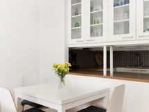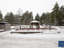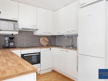 - Keittiön varusteet: Jääkaappipakastin, uuni, astianpesukone ja liesituuletin (hormi). Liesi: Keraaminen liesi. Työtason materiaali: Laminaatti.